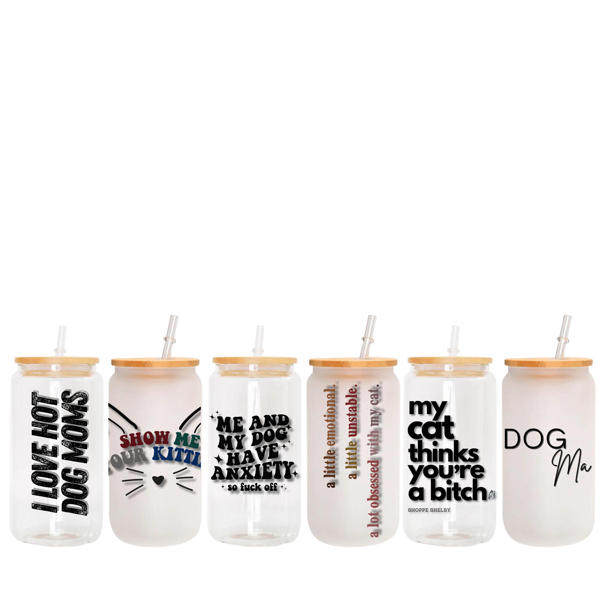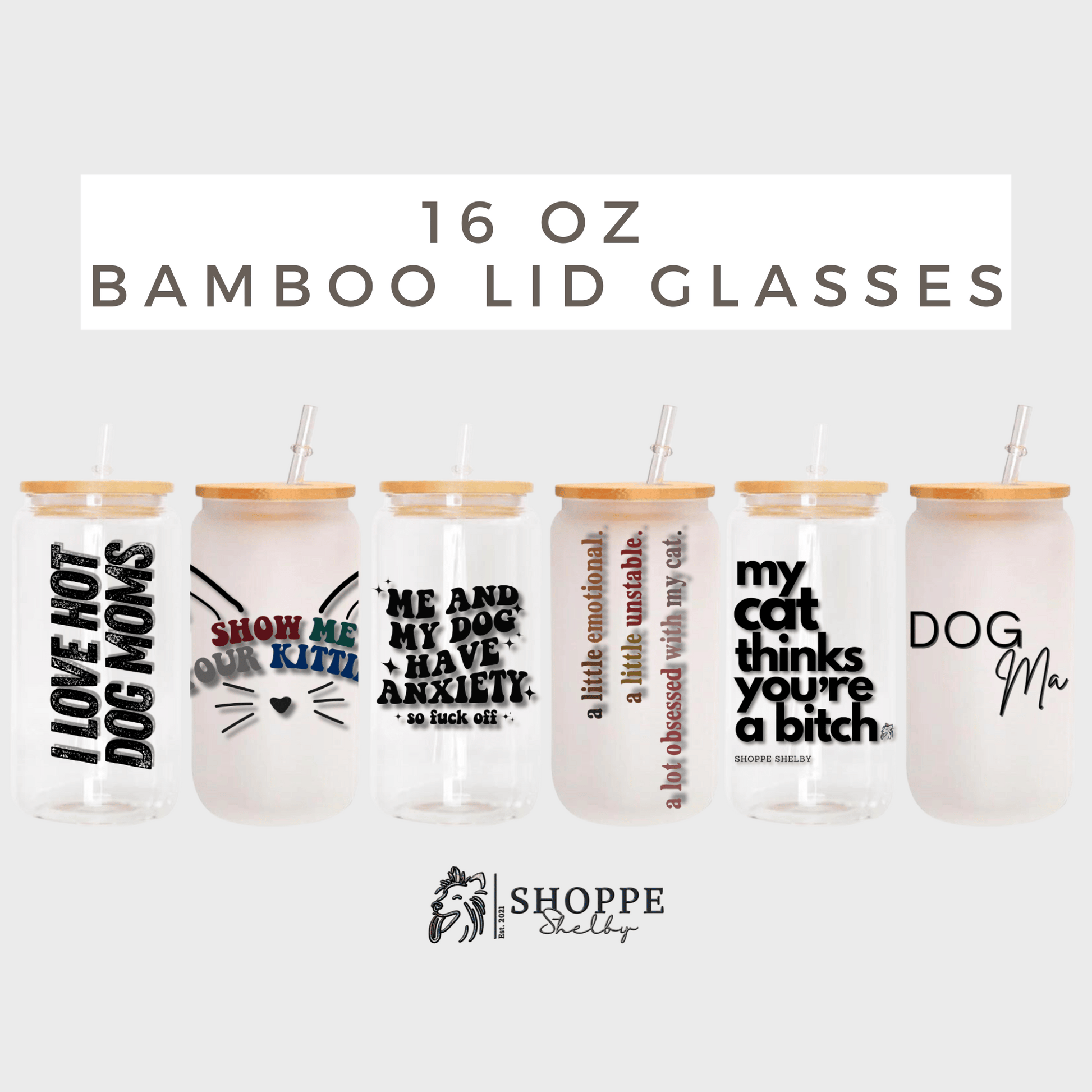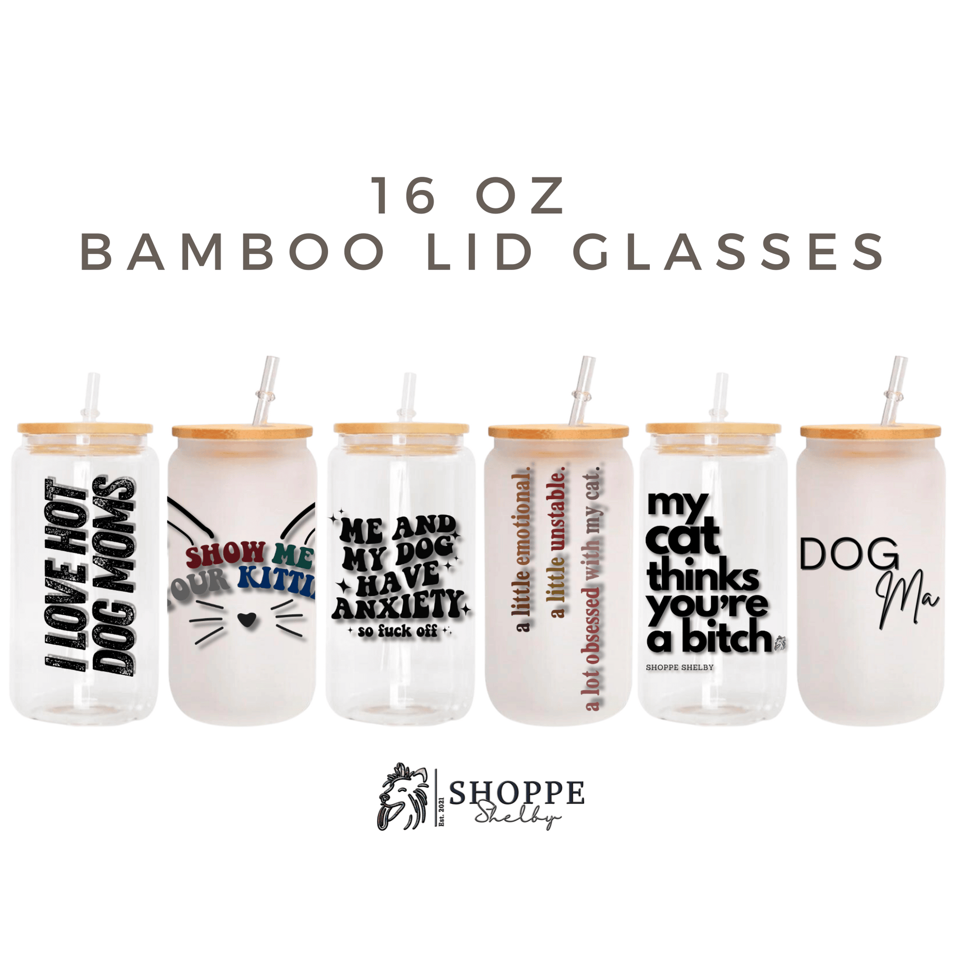 Discover our 16 oz Bamboo Lid Glasses – a stylish, eco-friendly choice for your favorite beverages. Choose between frosted or clear, and personalize with designs for pet lovers, mental health advocates, or adults who enjoy a little humor. Sublimation printing ensures your design won’t fade, and your purchase includes a complete set with three straws: glass, gold metal, and plastic. For long-lasting enjoyment, remember our care recommendations: gentle hand washing, avoiding high heat, and no abrasive materials for cleaning. Sip in style – order now!