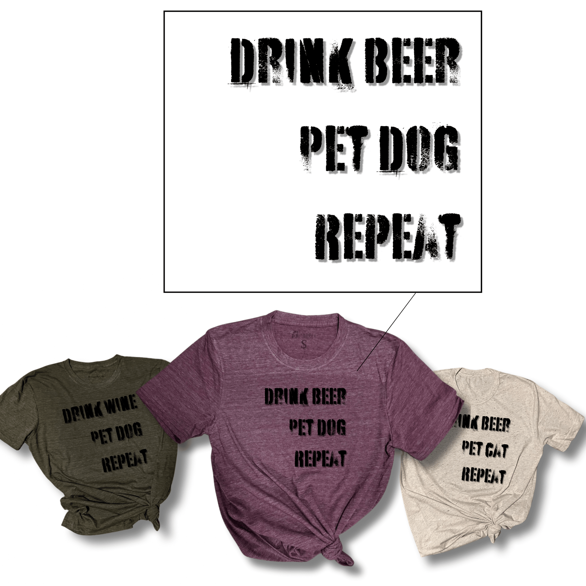 Our “Drink Beer, Pet Dog, Repeat” T-Shirt, available in three colors – Oatmeal, Burgundy, and Army Green. Crafted from a luxurious tri-blend of cotton, rayon, and polyester, this very soft, high-quality T-Shirt is proudly made in the USA. Choose any pet to personalize your statement. Sizes range from XS to 3XL, ensuring a comfortable fit for everyone. For care, hand wash or use the delicate cycle, and opt for low temperature drying or air drying. Express your love for dogs and your sense of humor.