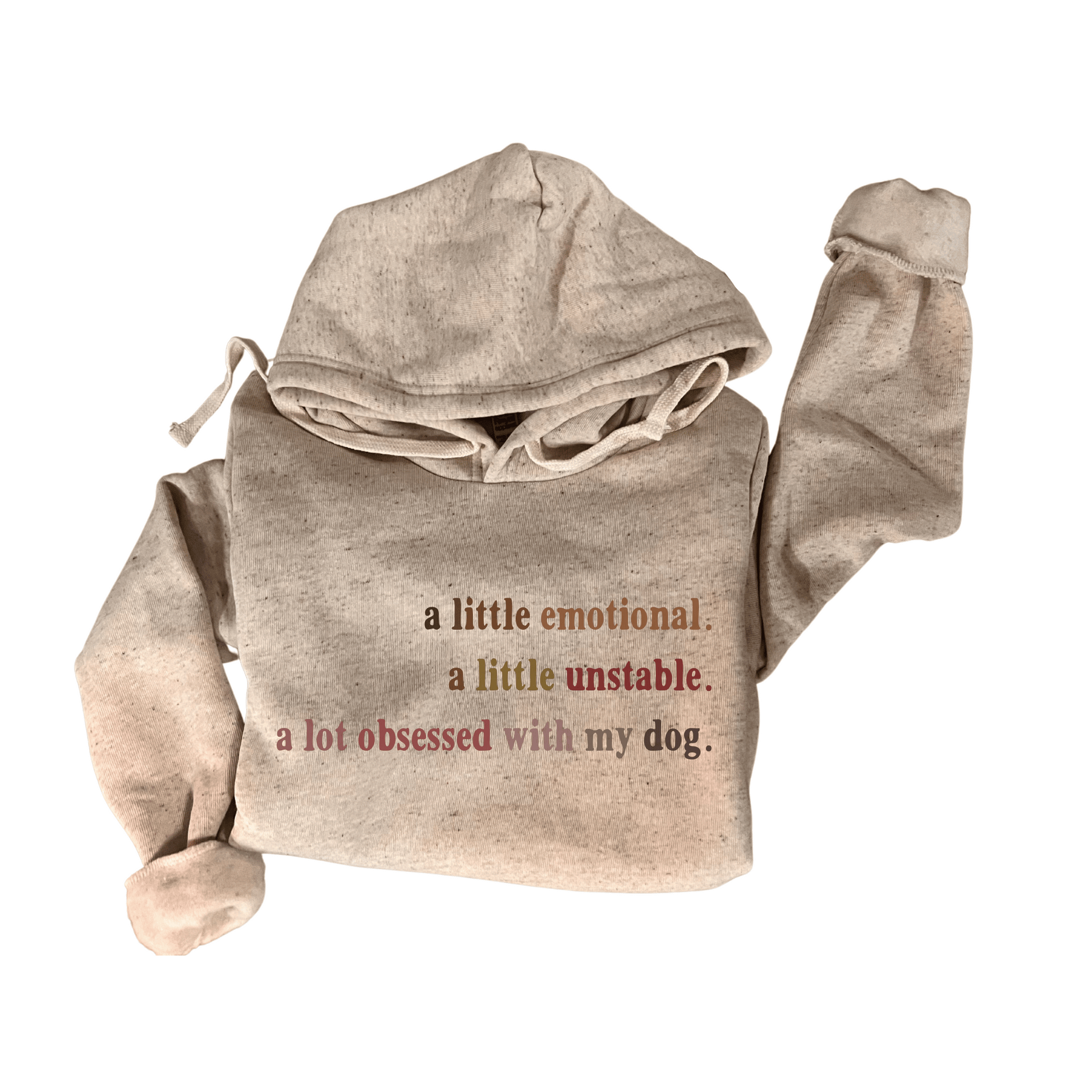 Embrace your dog obsession with our “Emotional, Unstable & Obsessed” Sweatshirt, available in crewneck or hoodie styles and two versatile colors – Oatmeal and Army Green. Crafted from a luxurious tri-blend of cotton, rayon, and polyester, this very soft, high-quality sweatshirt is proudly made in the USA. Choose any pet to personalize your statement. Sizes range from XS to 3XL, ensuring a comfortable fit for everyone. For care, hand wash or use the delicate cycle, and opt for low temperature drying or air drying. Express your love for dogs and your sense of humor.