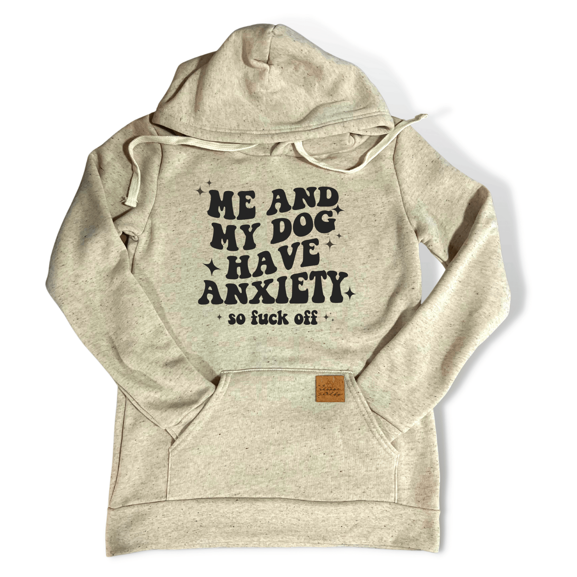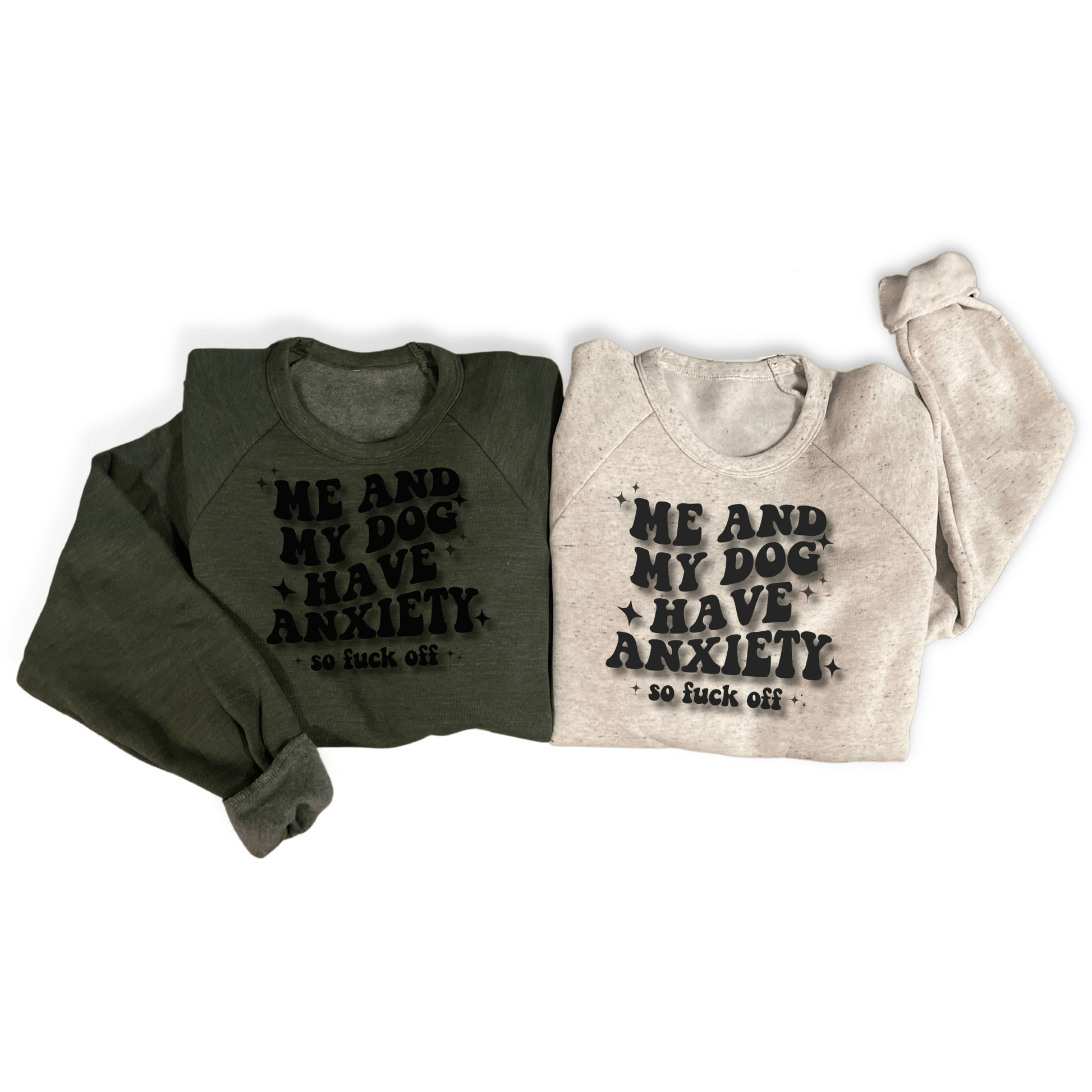Embrace your dog obsession with our “Me & My Dog Have Anxiety, so Fuck Off” Sweatshirt, available in crewneck or hoodie styles and two versatile colors – Oatmeal and Army Green. Crafted from a luxurious tri-blend of cotton, rayon, and polyester, this very soft, high-quality sweatshirt is proudly made in the USA. Choose any pet to personalize your statement. Sizes range from XS to 3XL, ensuring a comfortable fit for everyone. For care, hand wash or use the delicate cycle, and opt for low temperature drying or air drying. Express your love for dogs and your sense of humor.